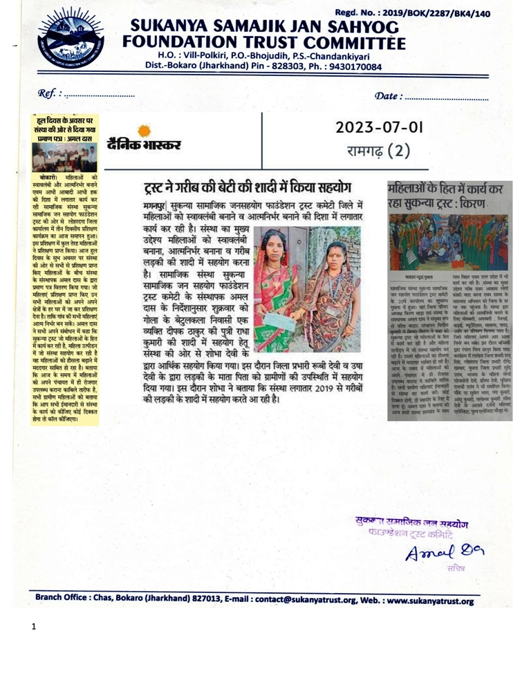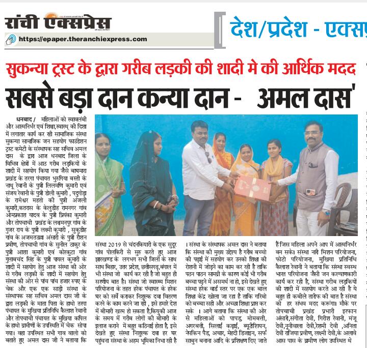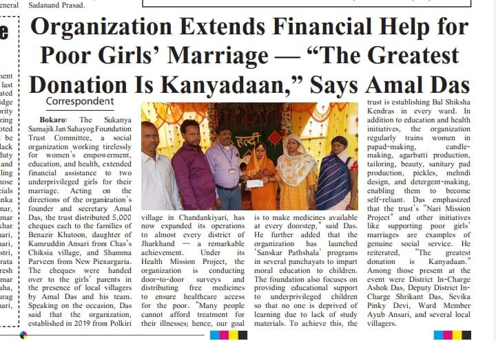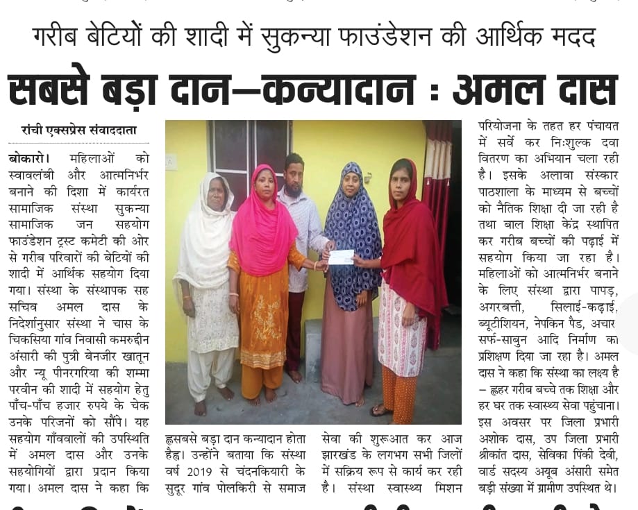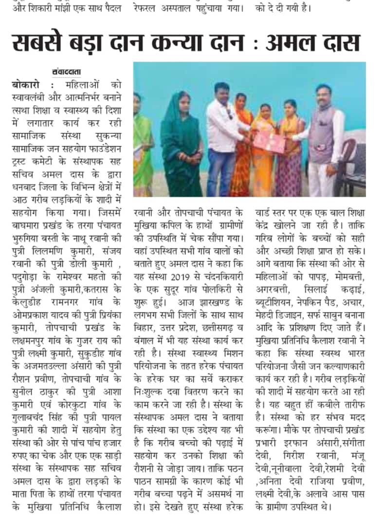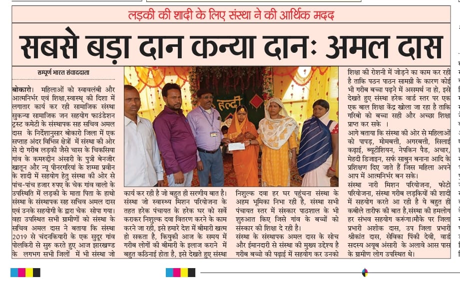 Ramgarh me Sukanya Trust Ki Or Se ladki KI sadi me Diya Gaya Check 01.07.2023