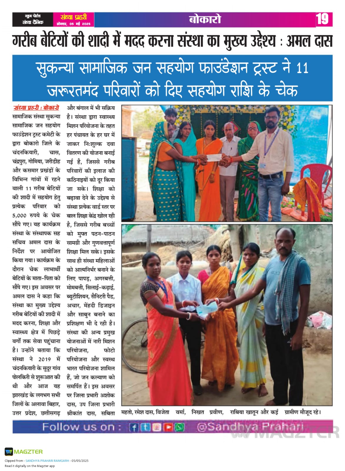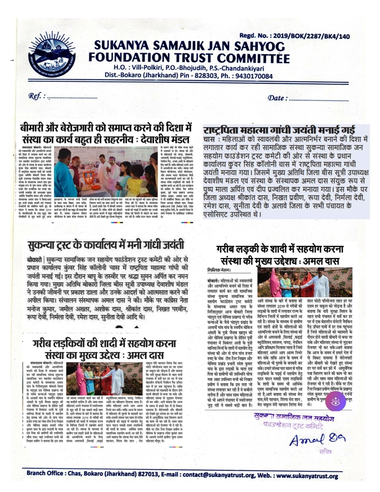 Sukanya Samajik Jan Sahyog Foundation trust Committee ME GANDHI JAYANTI MANAYA GAYA Ki ladki KI sadi me Diya Gaya Check