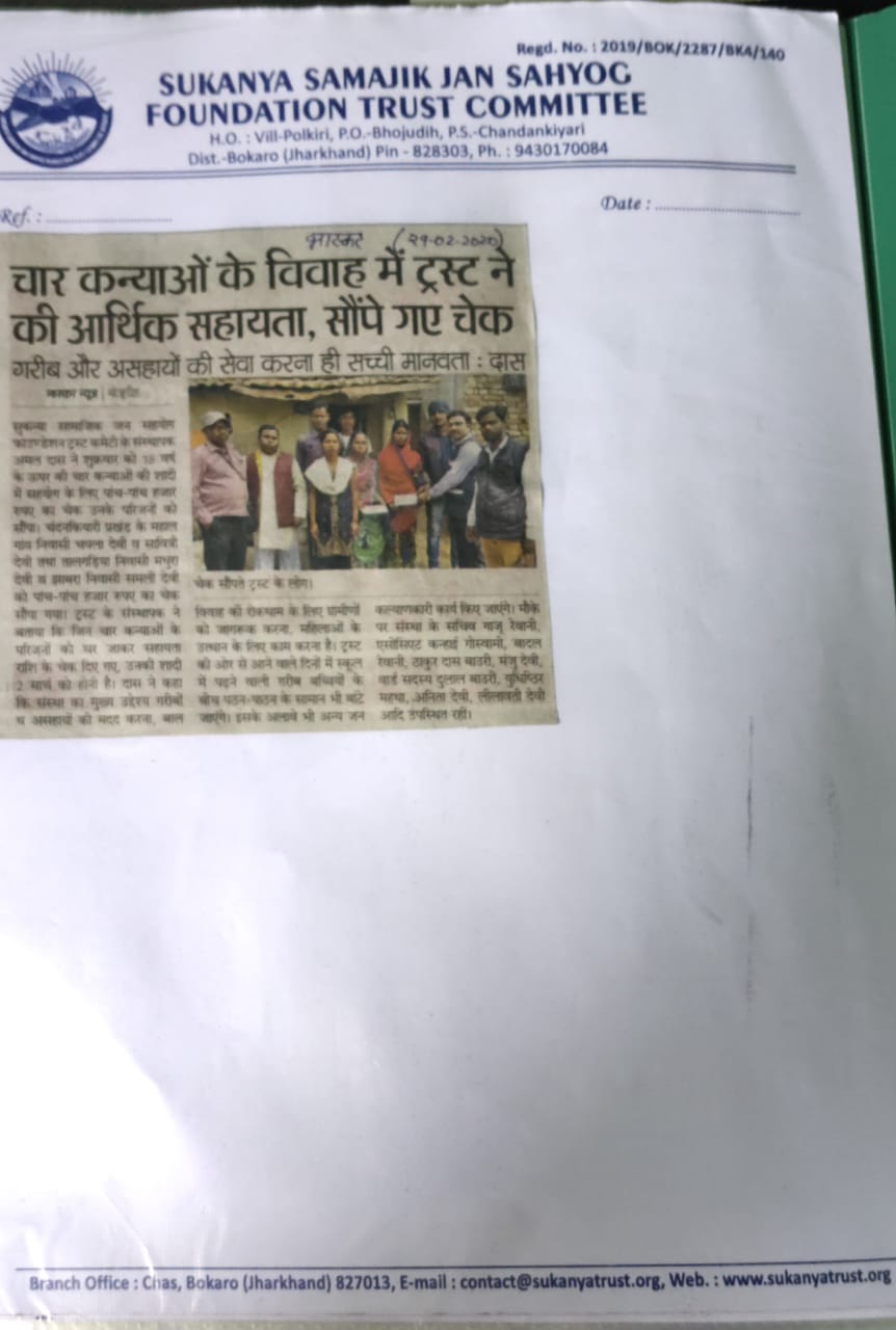 Sukanya Samajik Jan Sahyog Foundation trust Committee Ki Or Se ladki KI sadi me Diya Gaya Check 5.2.2023